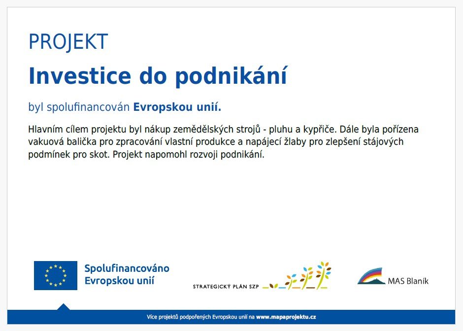Projekt je zaměřený na pořízení strojů pro přípravu půdy, investici do živočišné výroby a zpracování vlastní produkce. V rámci projektu bude zakoupen pluh, kypřič, vakuová balička a napájecí žlaby.
